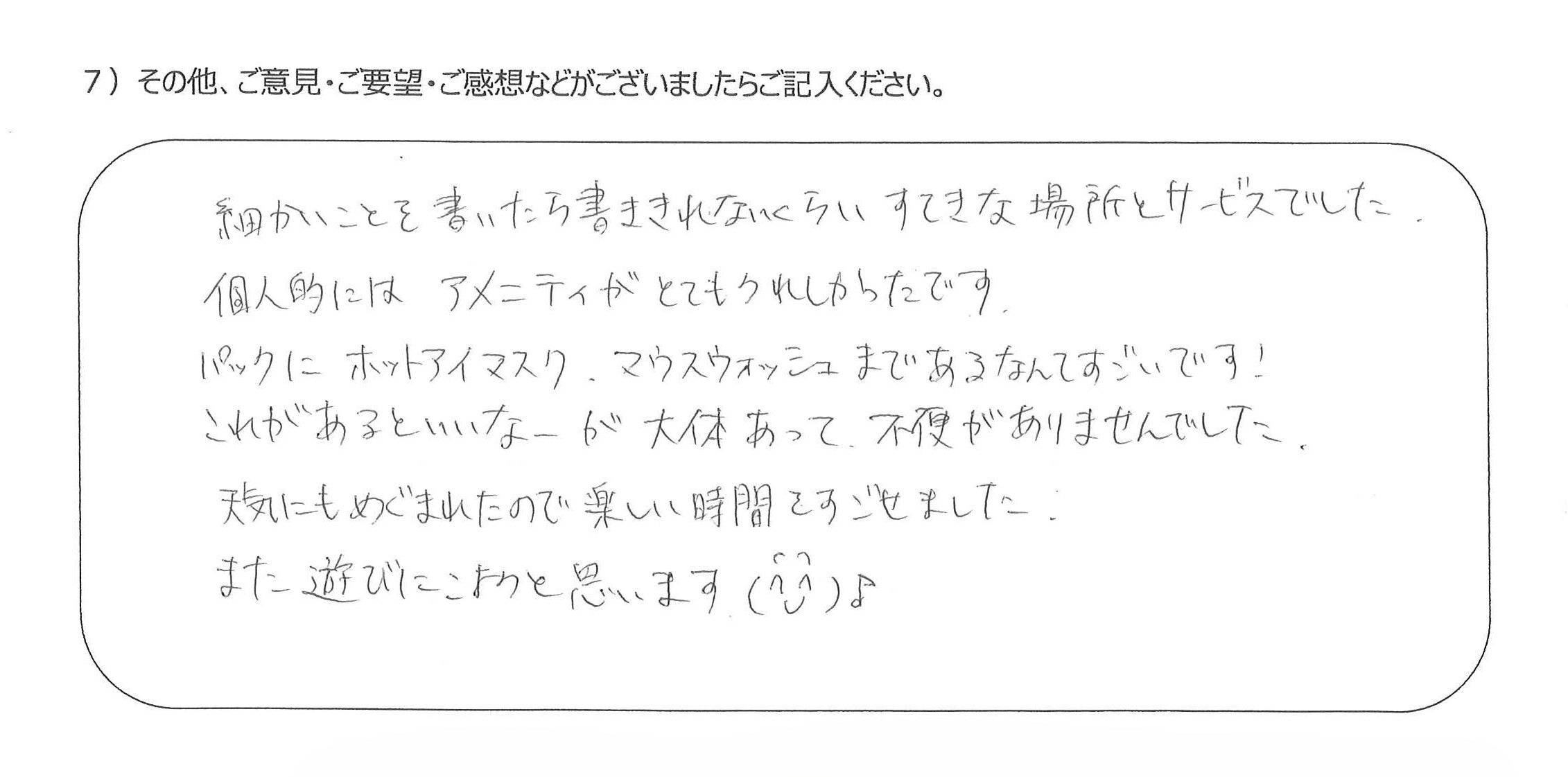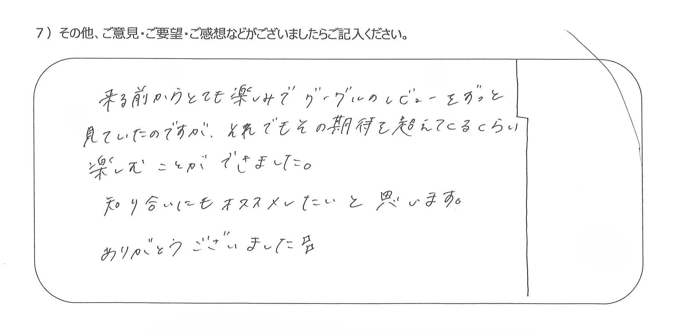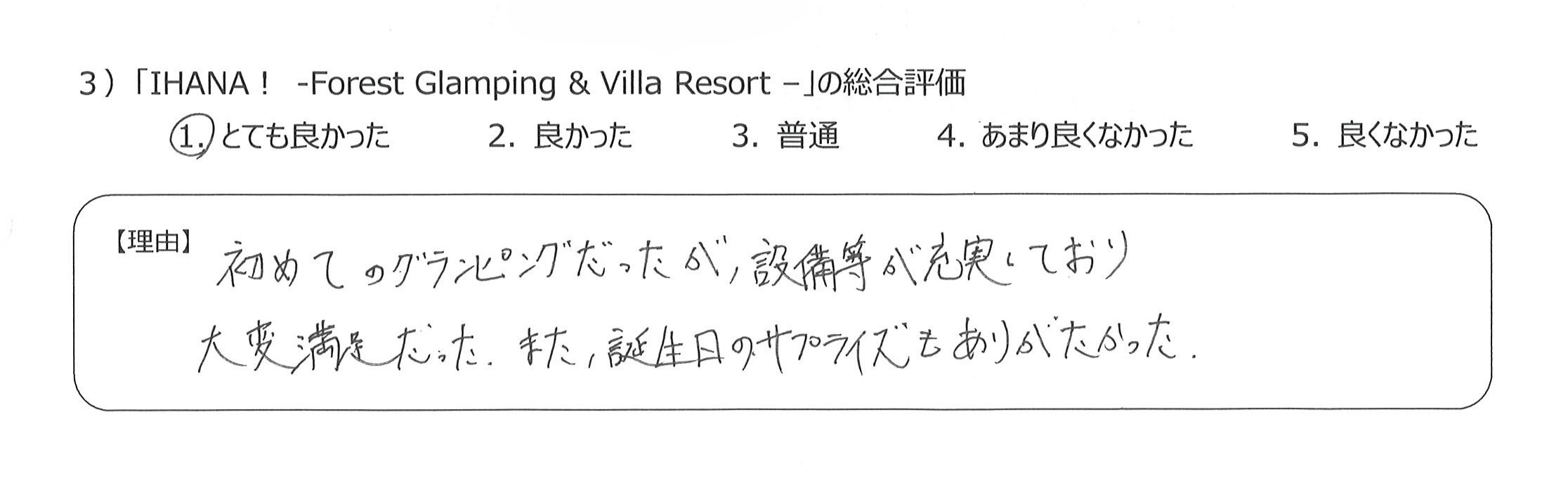 大変満足だった。また、誕生日のサプライズもありがたかった。7)また、利用させて頂きます。