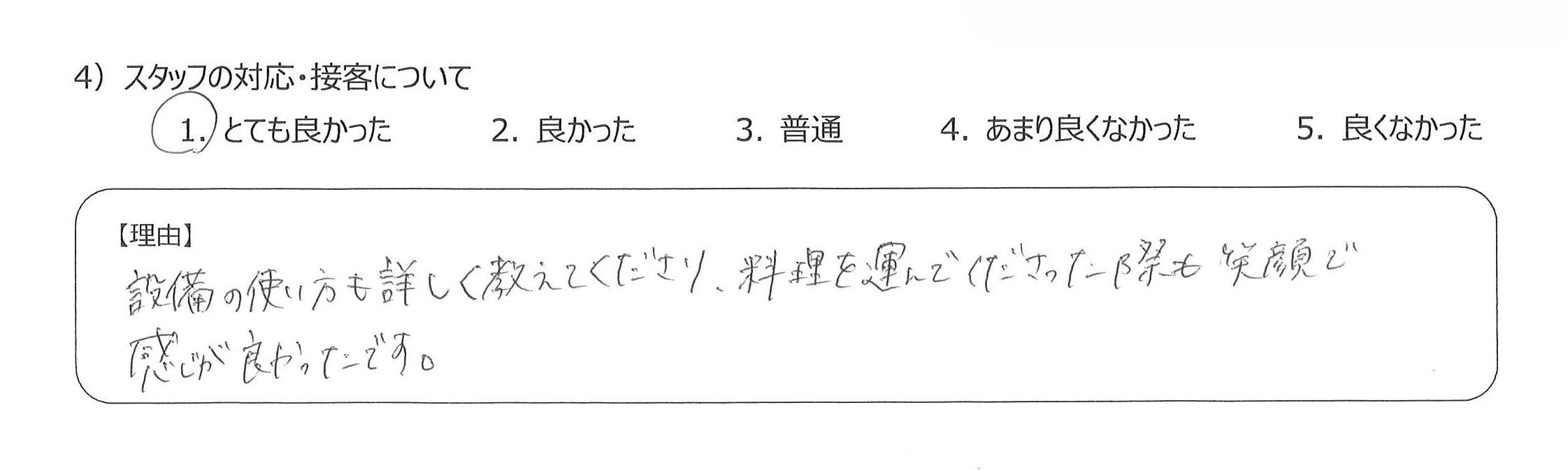 設備の使い方も詳しく教えてくださり、料理を運んでくださった際も笑顔で