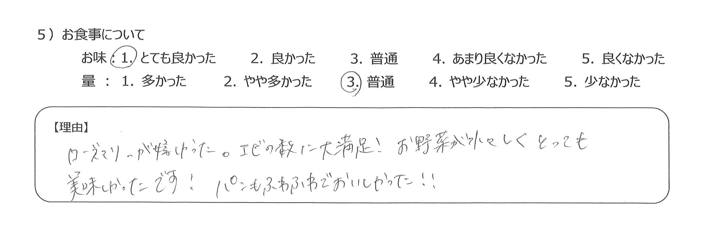 感じが良かったです。ローズマリーが嬉しかった。エビの数に大満足!お野菜が水々しくとっても