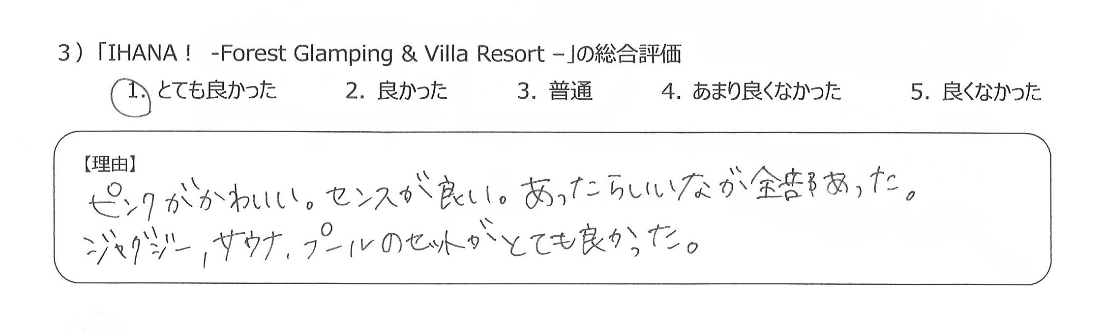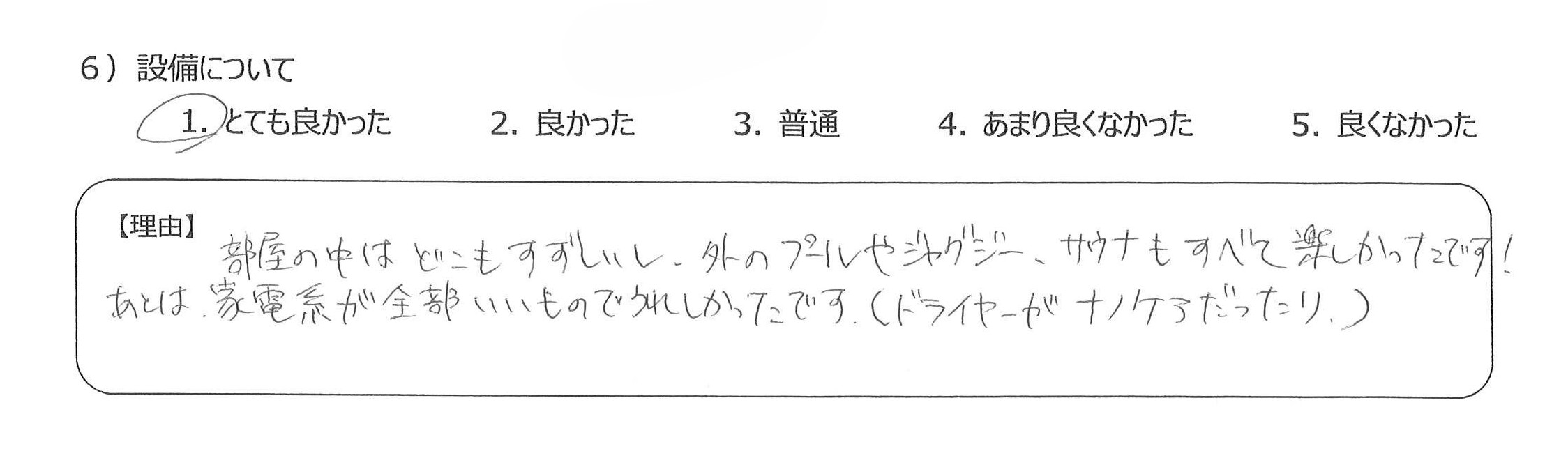 笑顔もすてきでお話ししやすかったです。6)部屋の中はどこもすずしいし、外のプールやジャグジー、サウナもすべて楽しかったです!