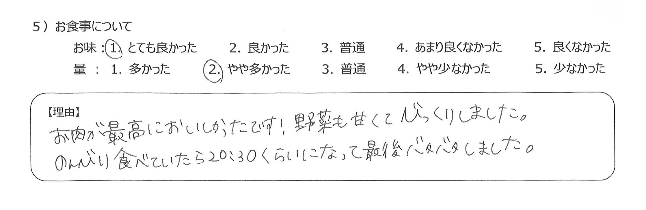 ジャグジー、サウナ、プールのセットがとても良かった。5)お肉が最高においしかったです!野菜も甘くてびっくりしました。