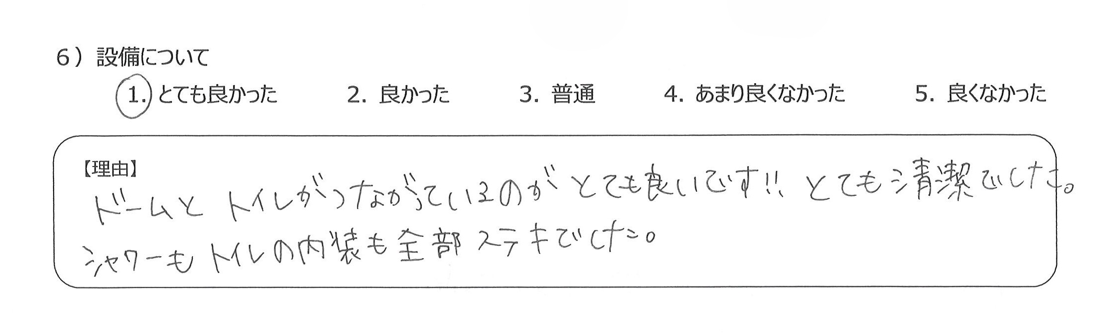 のんびり食べていたら20:30くらいになって最後にバタバタしました。6)ドームとトイレがつながっているのがとても良いです!!とても清潔でした。