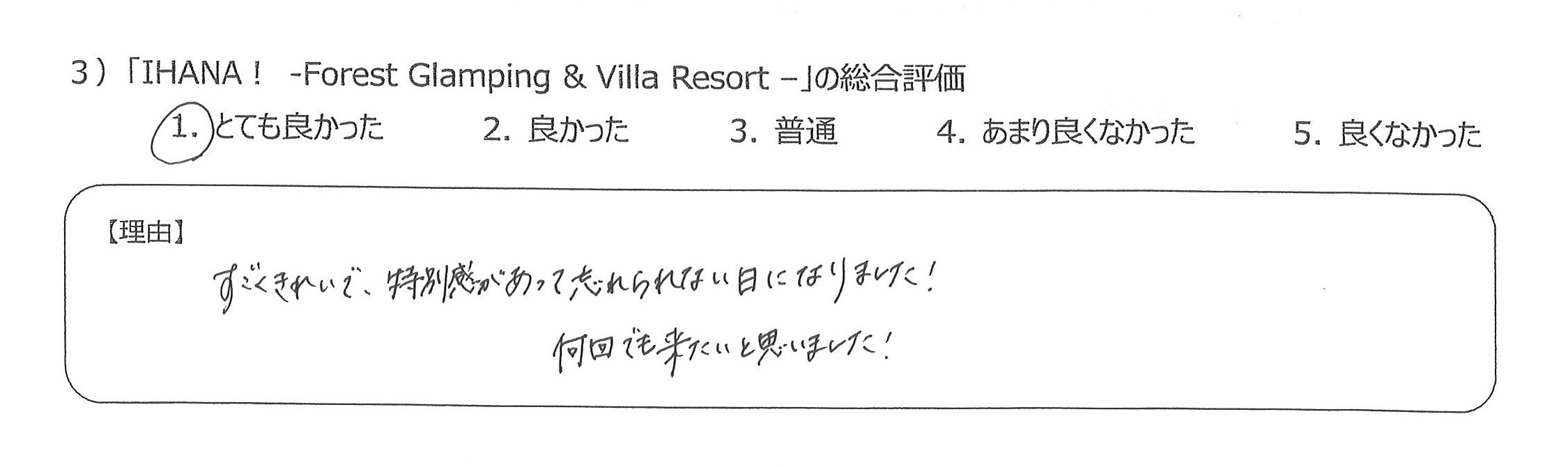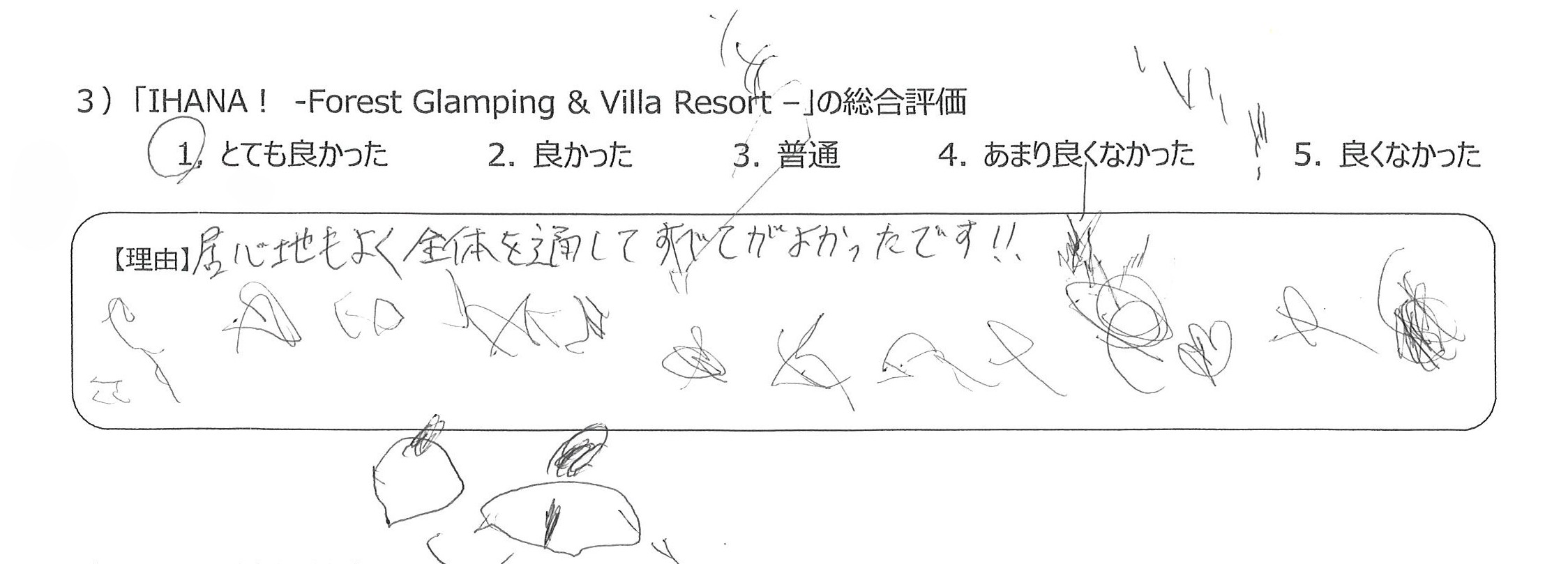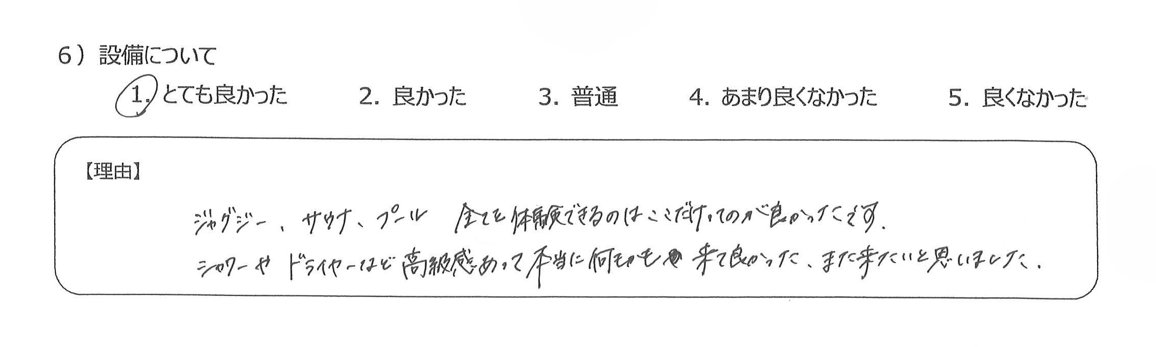 シャワーやドライヤーなど高級感あって本当に何もかも来て良かった。また来たいと思いました。7)本当に何もかもが良かったです。