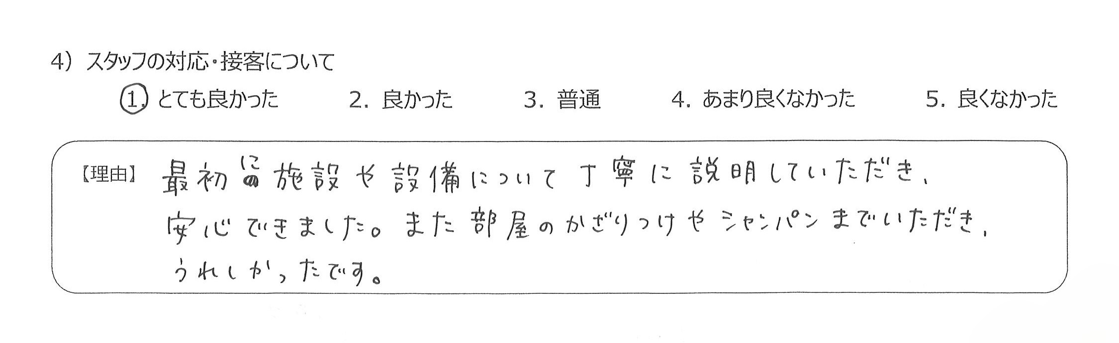 安心できました。また部屋のかざりつけやシャンパンまでいただき、