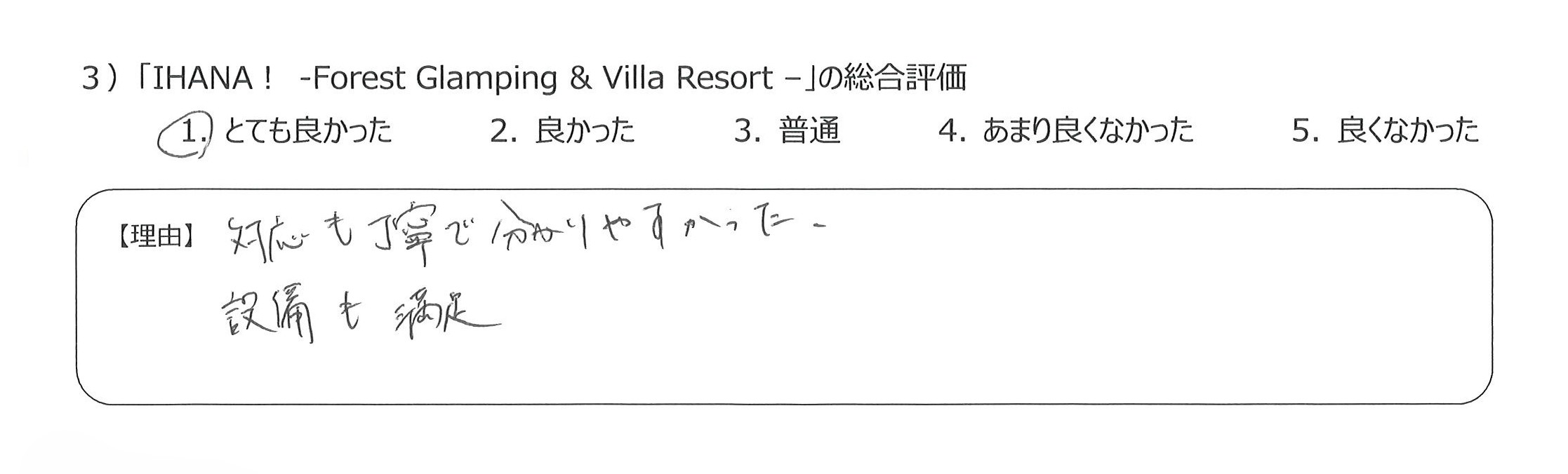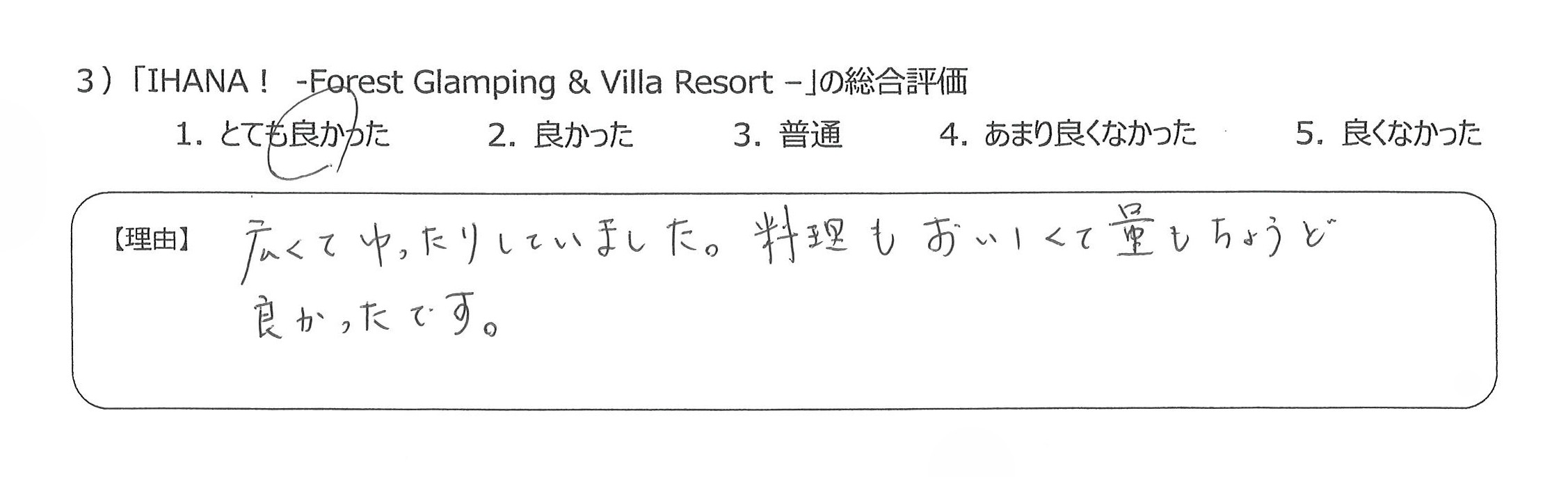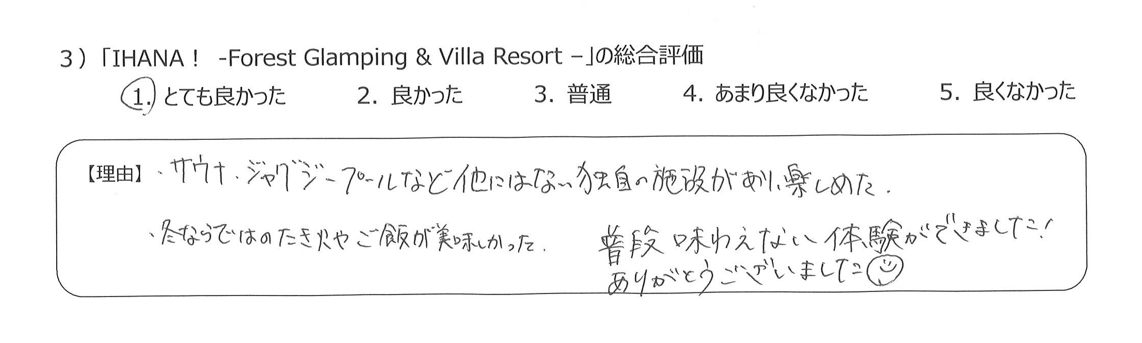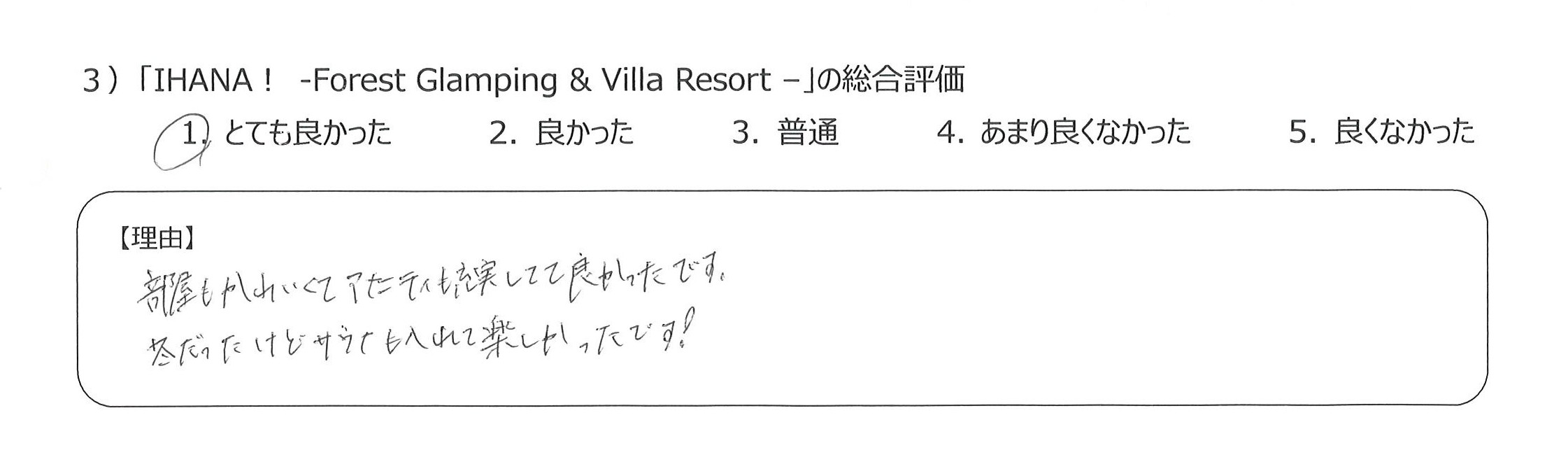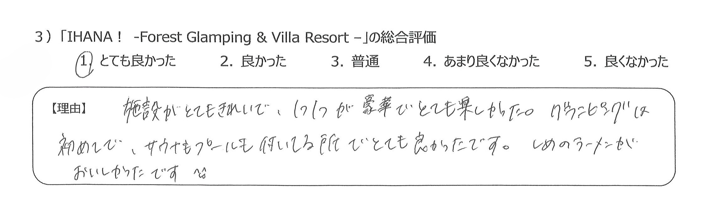 3)施設がとてもきれいで、1つ1つが豪華でとても楽しかった。グランピングは
