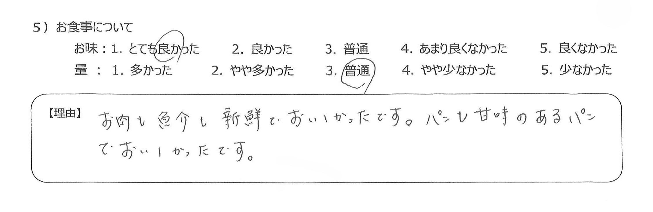 家族でゆっくり出来て良いです。5)お肉も魚介も新鮮でおいしかったです。パンも甘味のあるパン