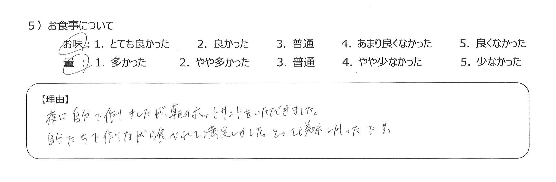 笑顔で明るく話して下さり、楽しめました。5)夜は自分で作りましたが、朝のホットサンドをいただきました。