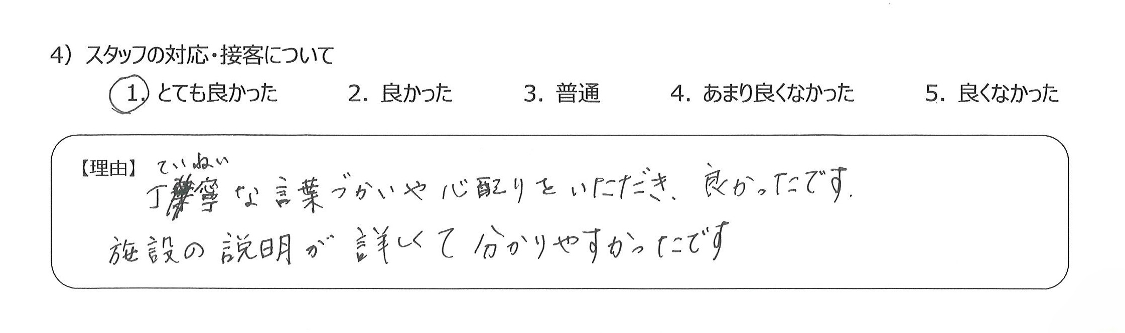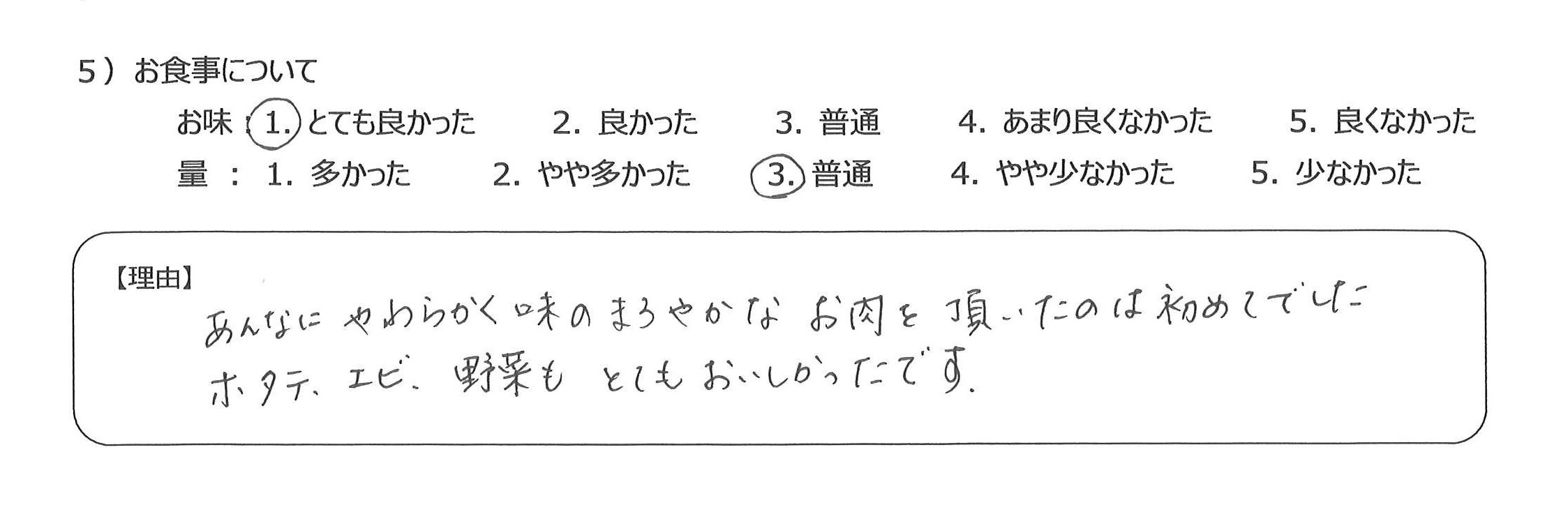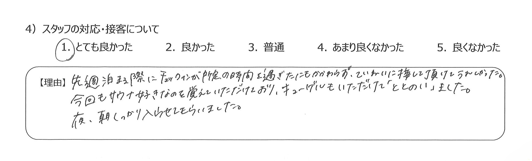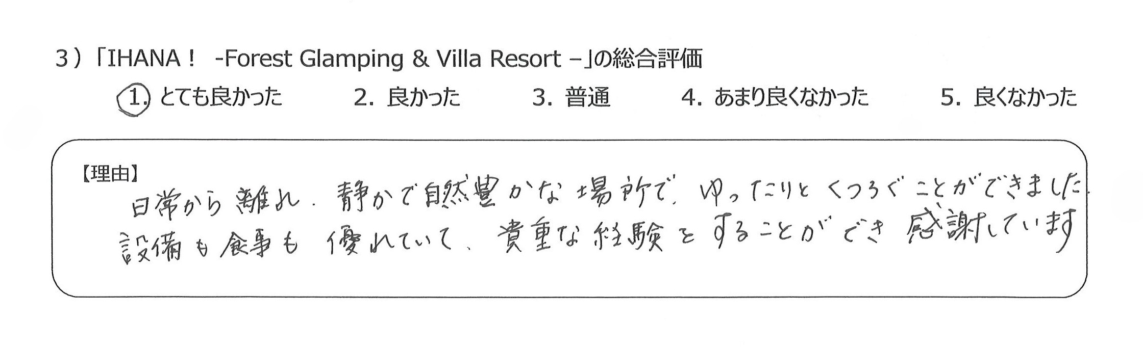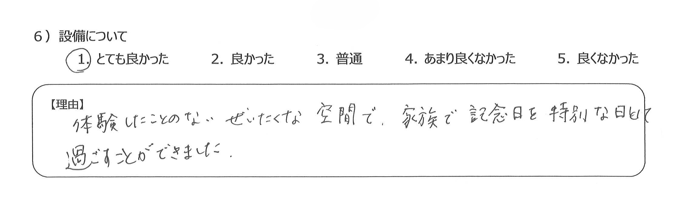 設備も食事も優れていて、貴重な経験をすることができ感謝しています4)丁寧な言葉づかいや心配りをいただき、良かったです。