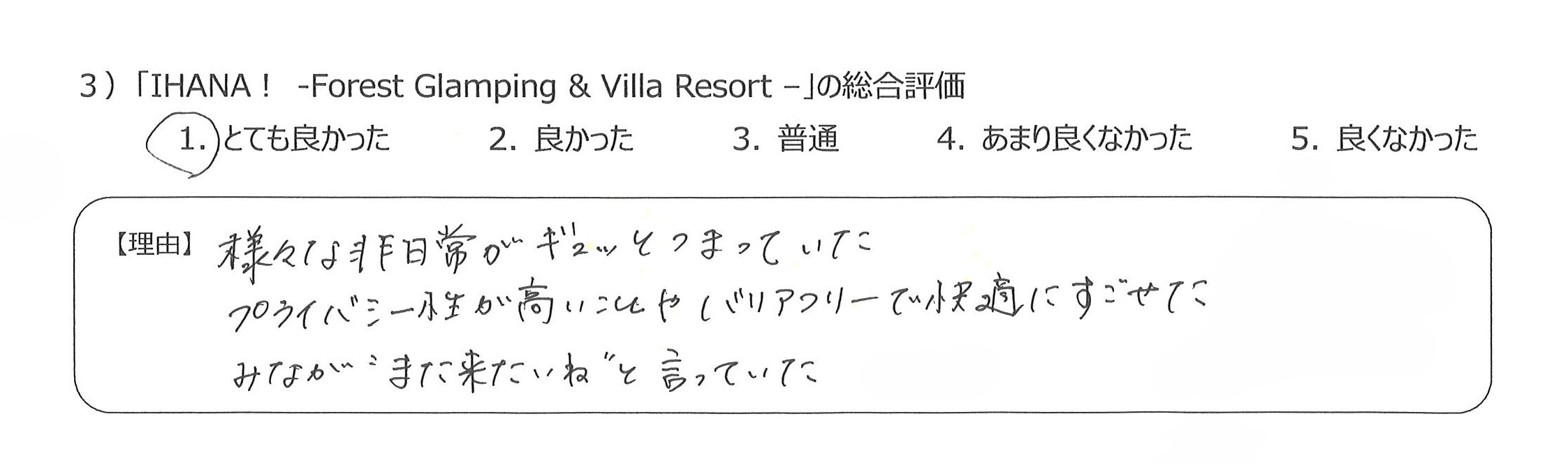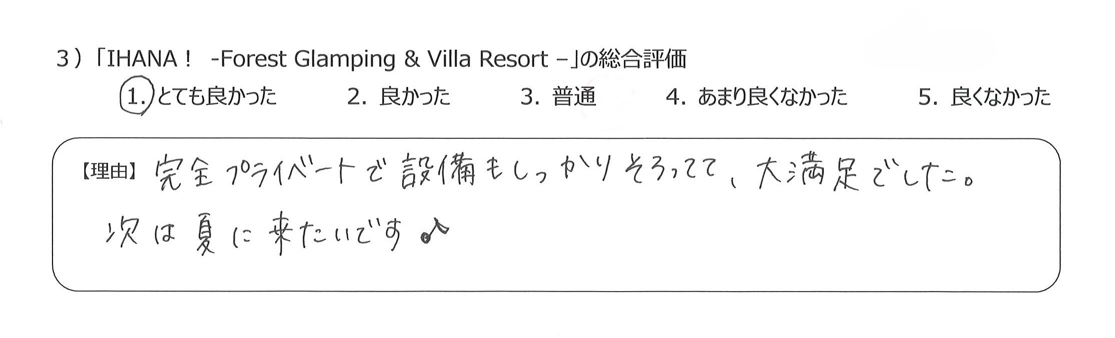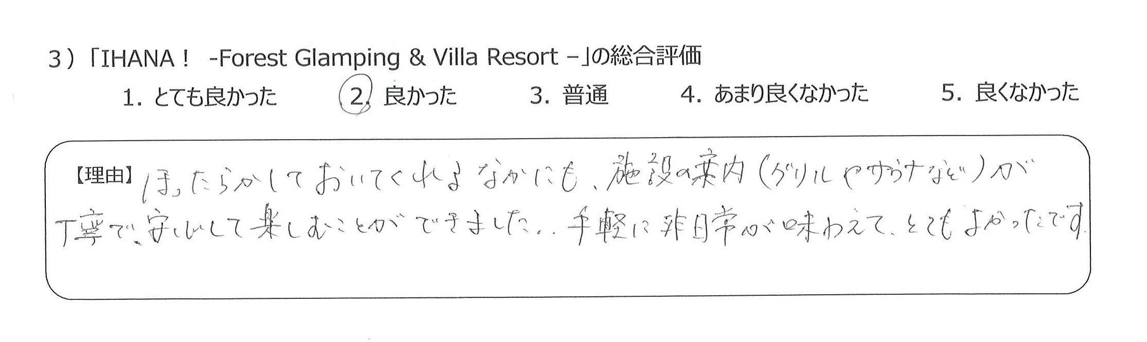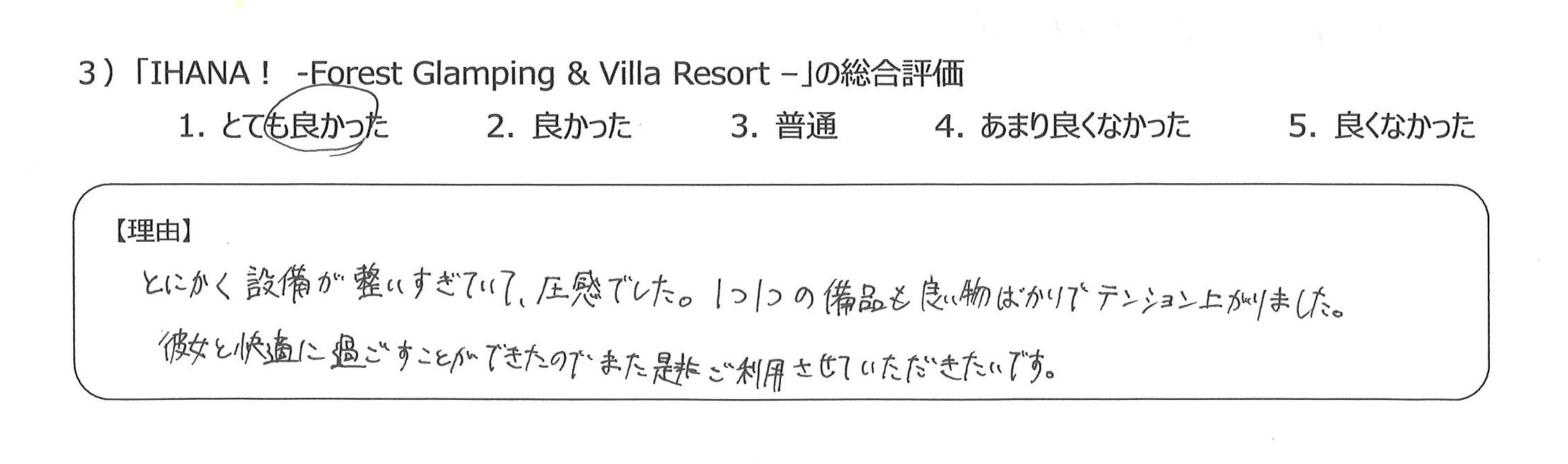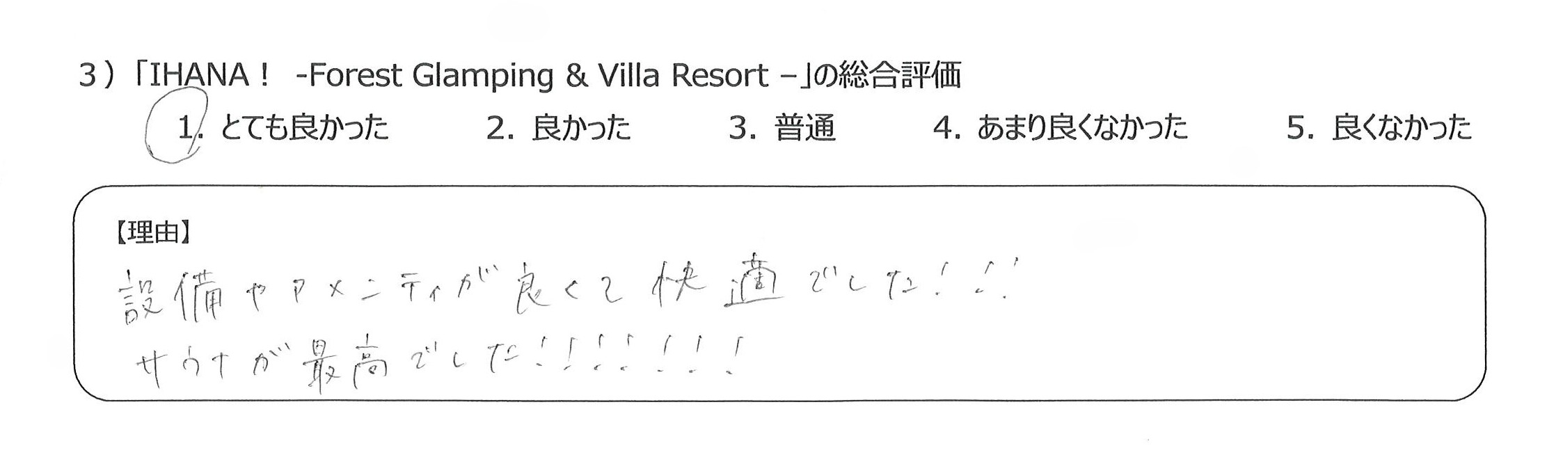 設備も食事も優れていて、貴重な経験をすることができ感謝しています4)丁寧な言葉づかいや心配りをいただき、良かったです。