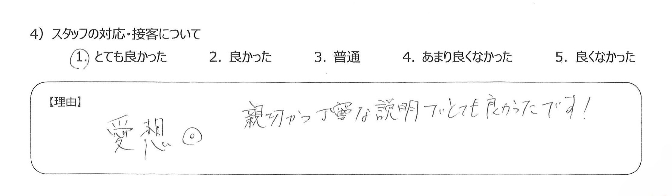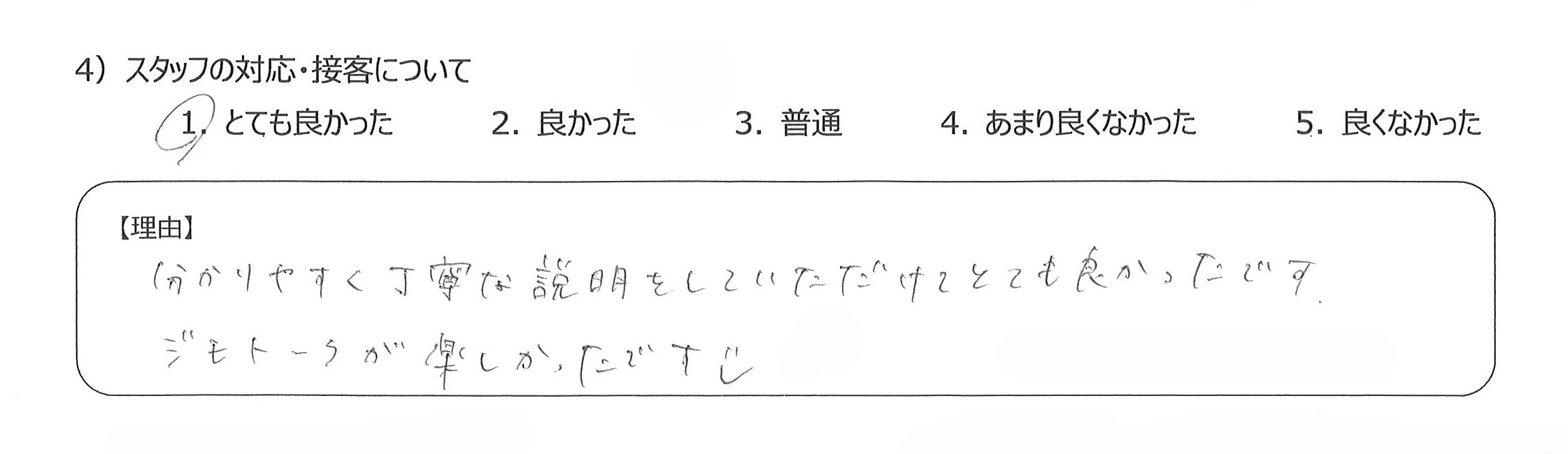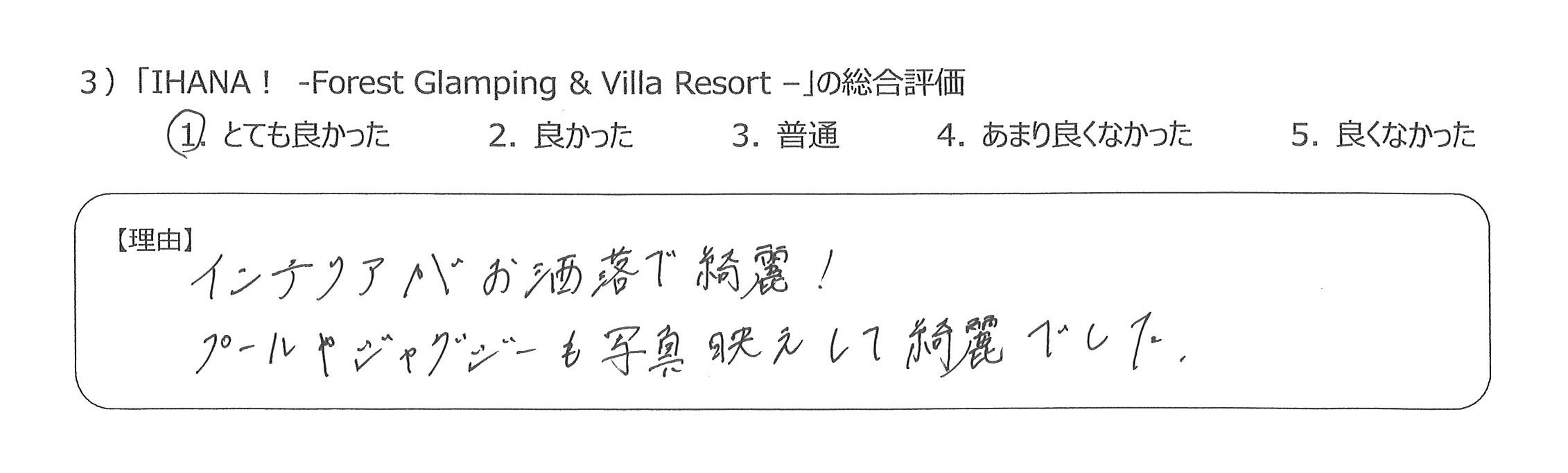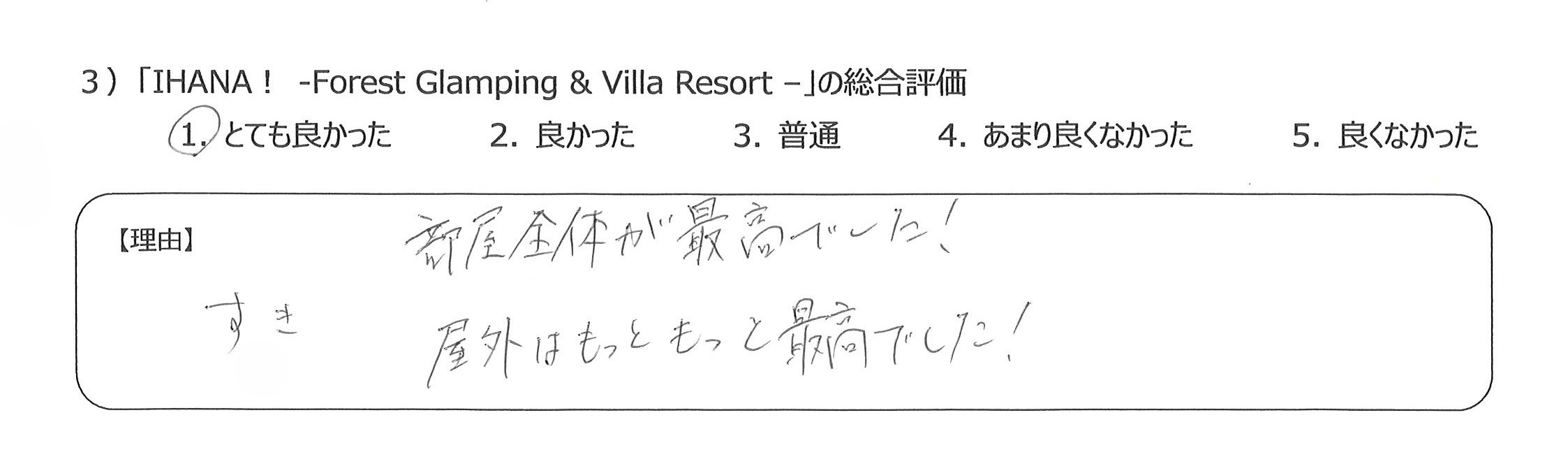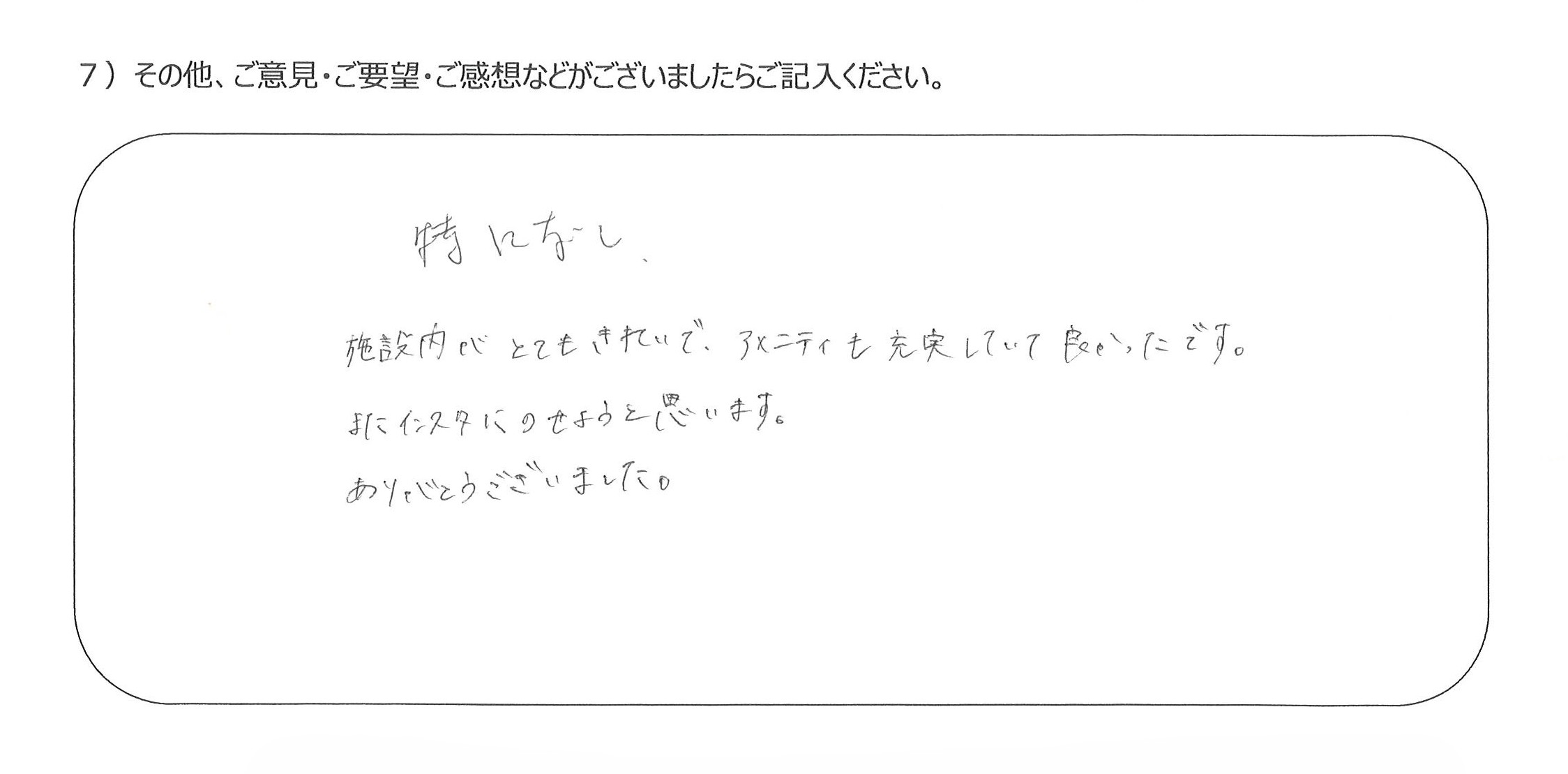 設備も食事も優れていて、貴重な経験をすることができ感謝しています4)丁寧な言葉づかいや心配りをいただき、良かったです。