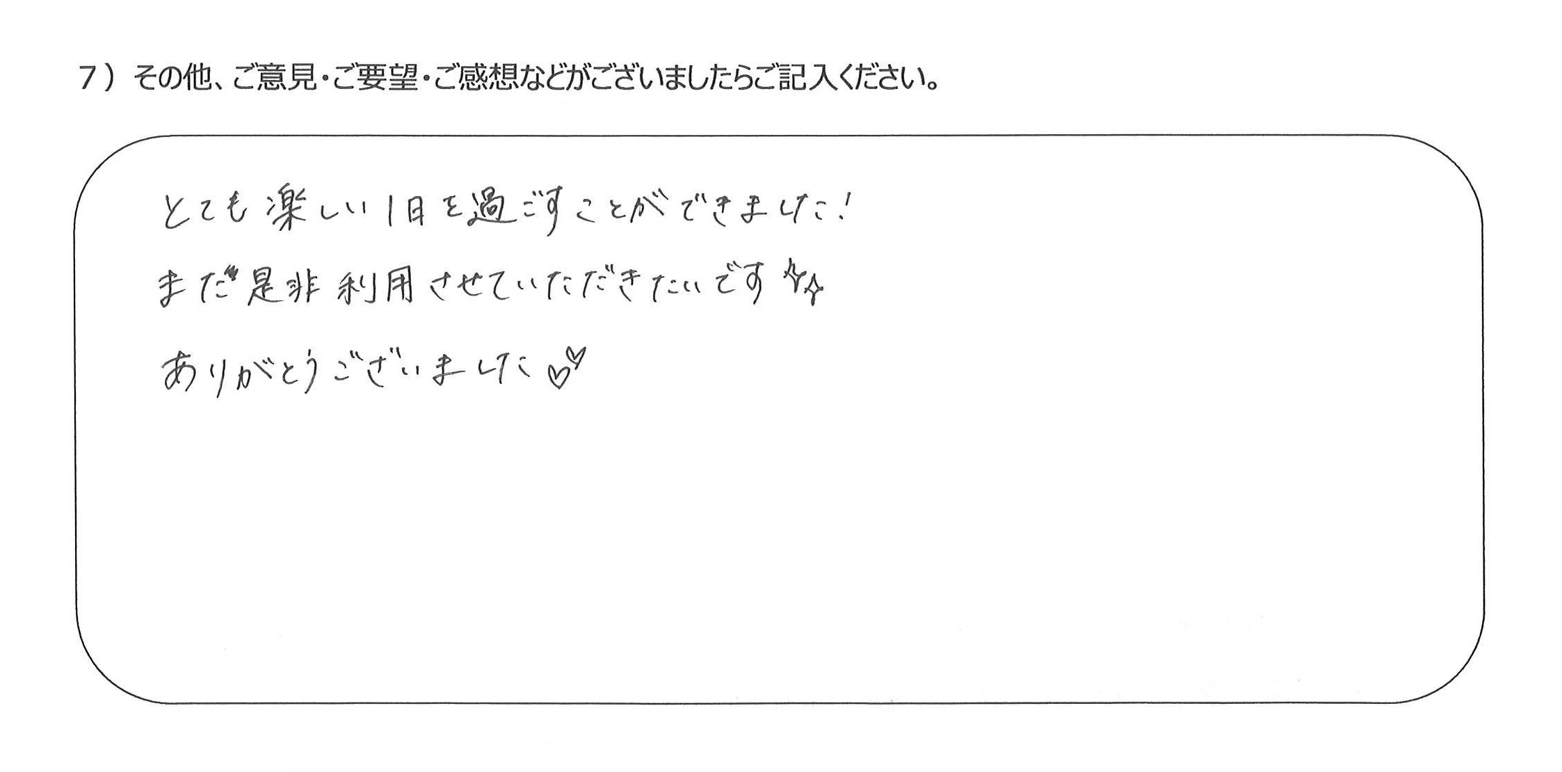 彼女と快適に過ごすことができたのでまた是非ご利用させていただきたいです。とても楽しい1日を過ごすことができました!
