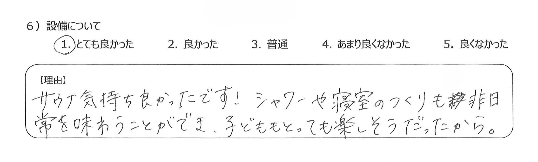 常を味わうことができ、子どももとっても楽しそうだったから。7)至れり尽くせり、本当にとっても居心地が良かったです!!