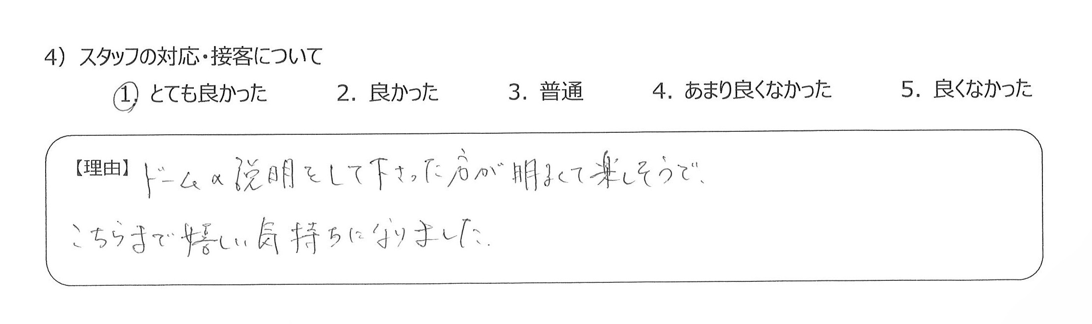 丁寧で、安心して楽しむことができました。手軽に非日常が味わえて、とてもよかったです。4)ドームの説明をして下さった方が明るくて楽しそうで、