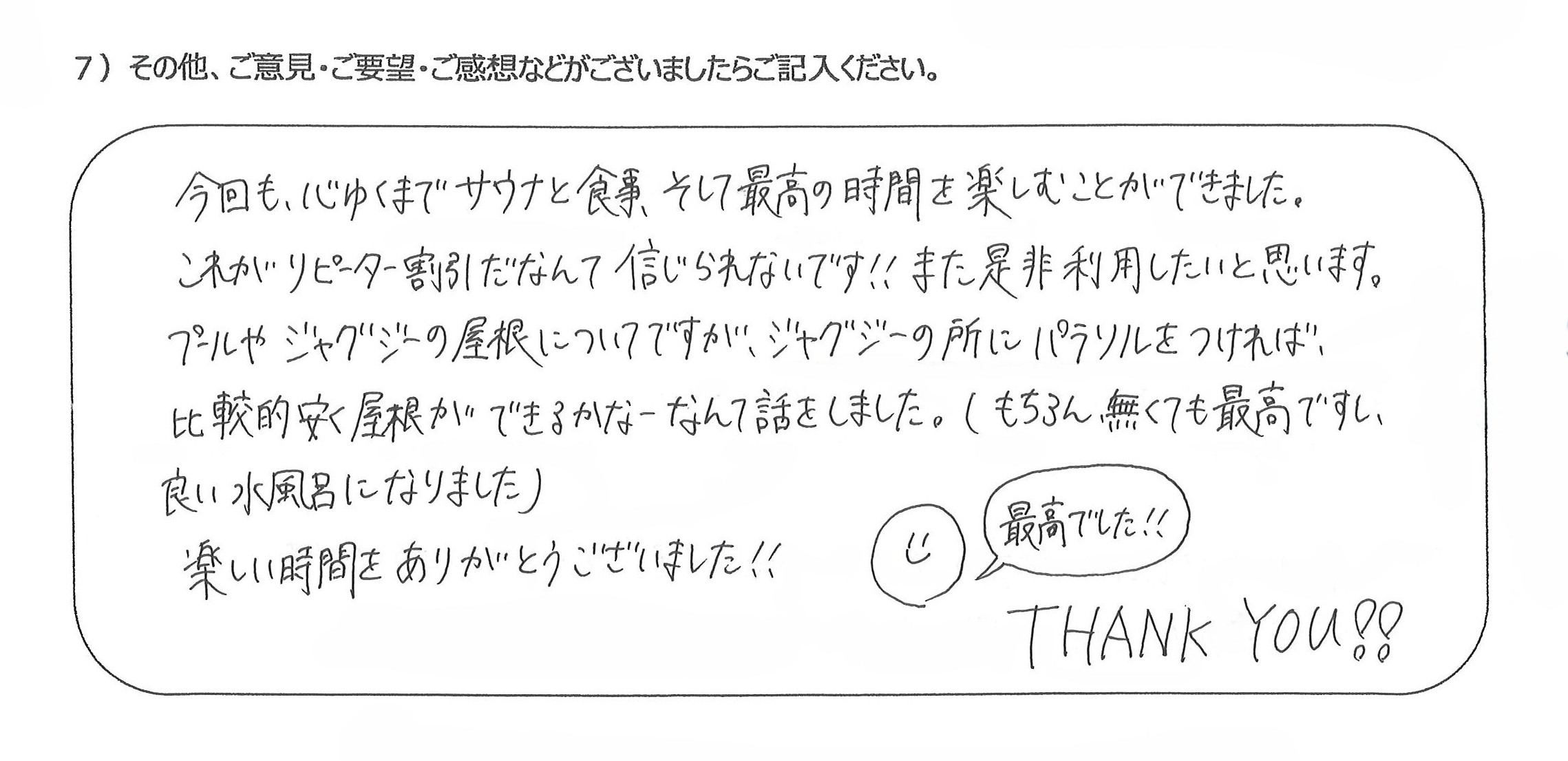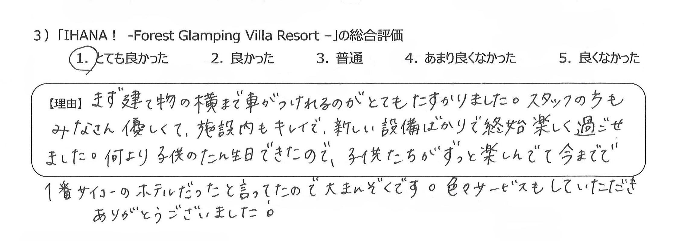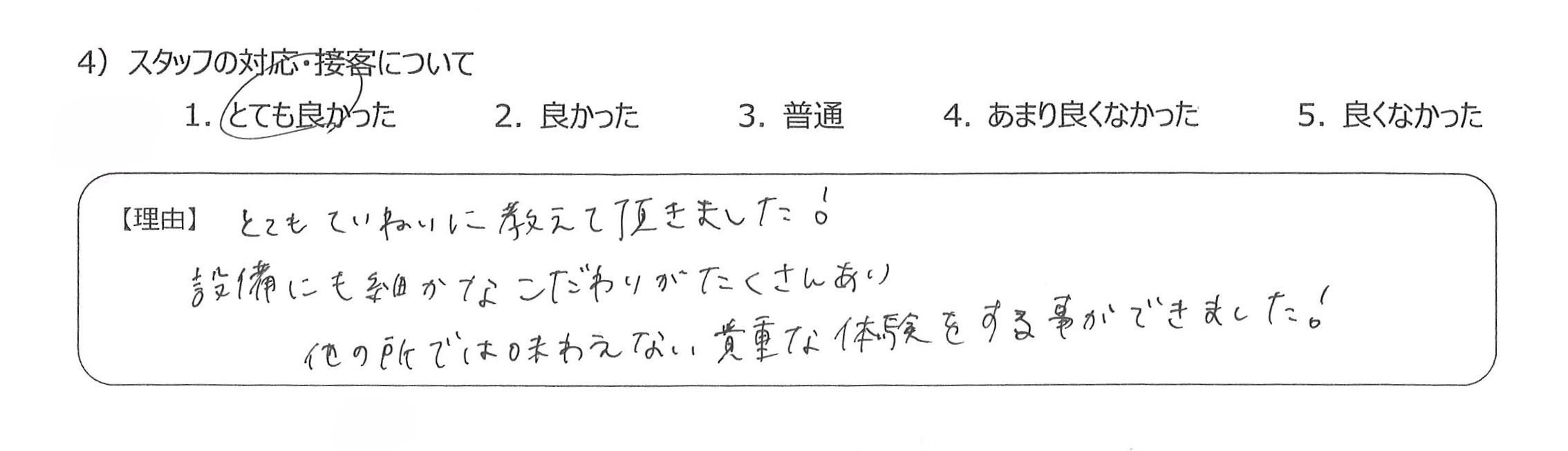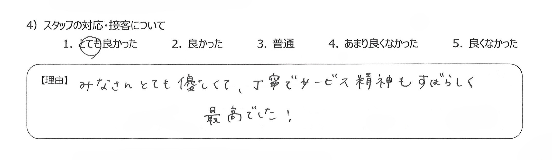 ありがとうございました。4)みなさんとても優しくて、丁寧でサービス精神もすばらしく