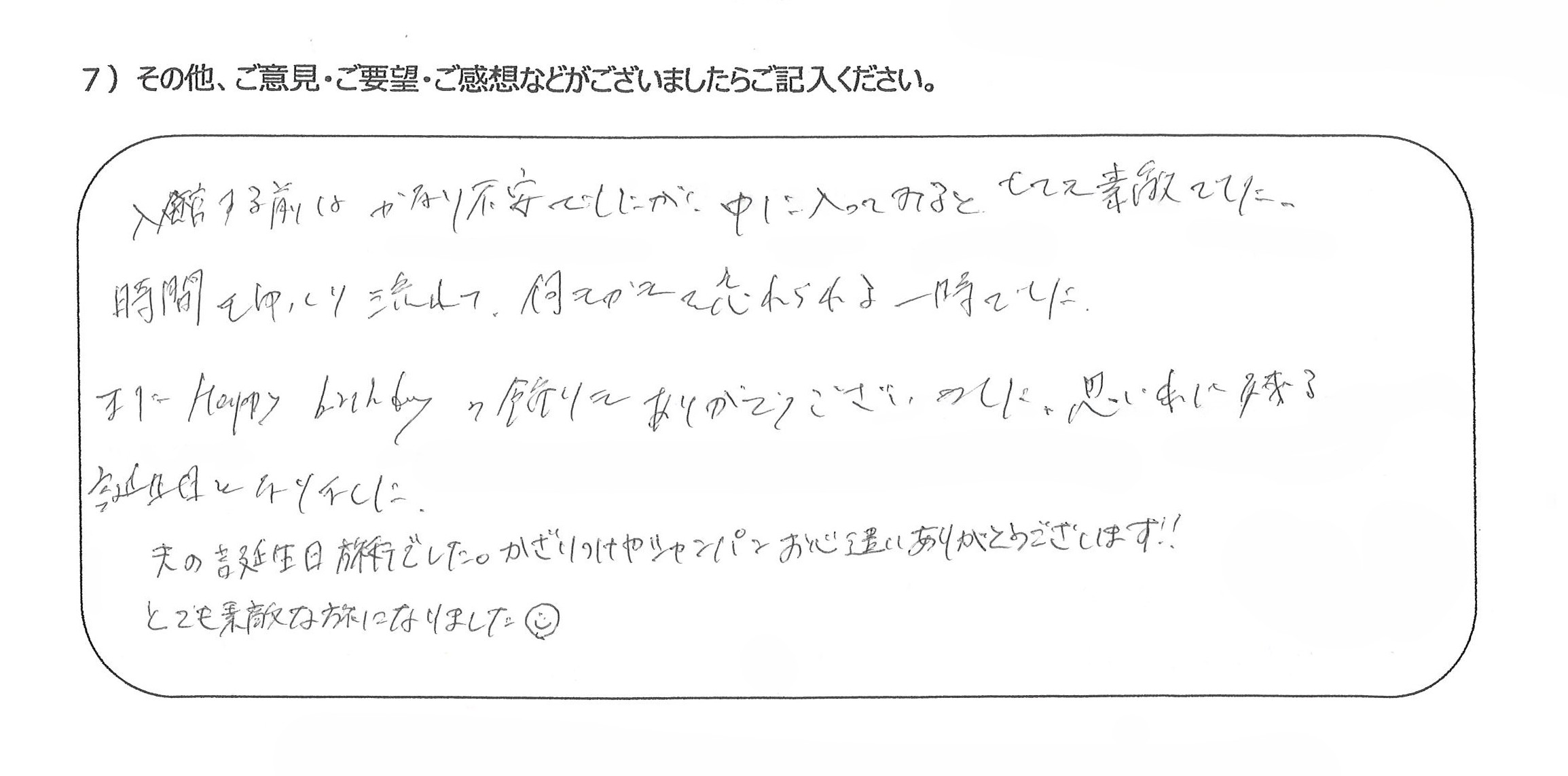 夫の誕生日旅行でした。かざりつけやシャンパンお心遣いありがとうございます!!