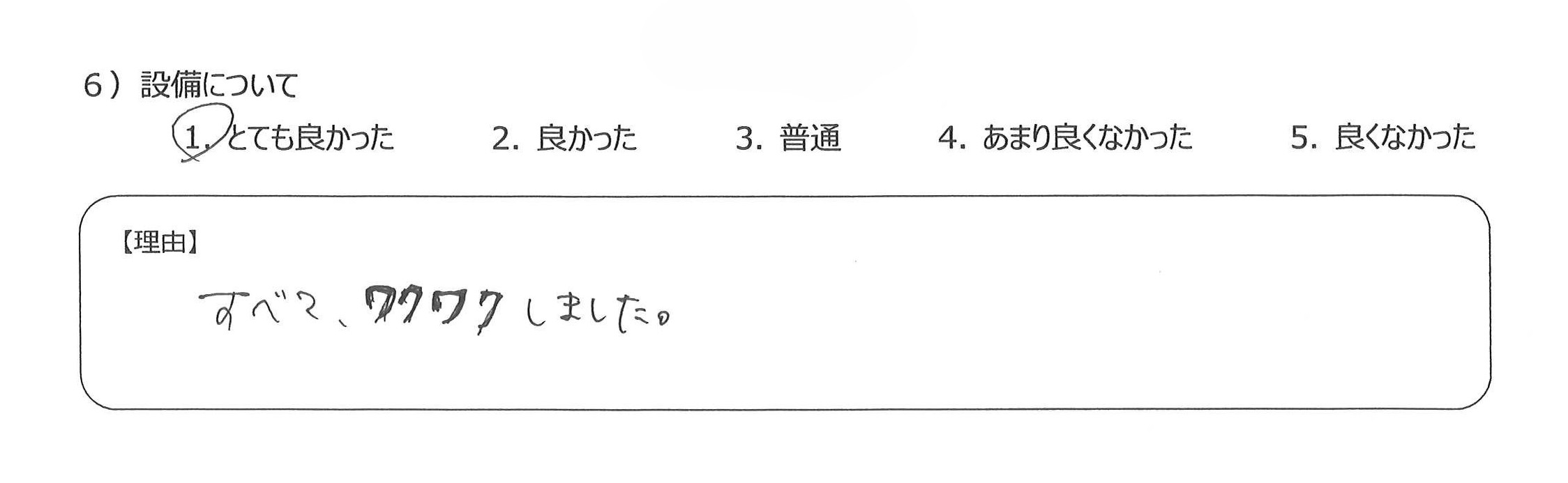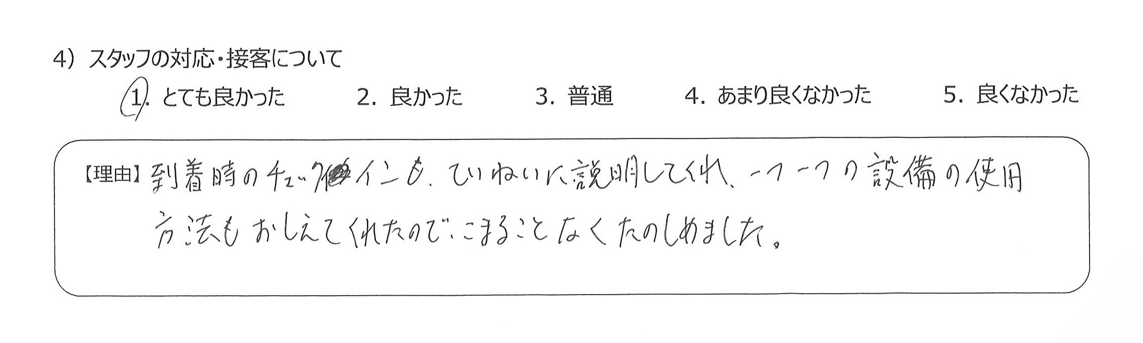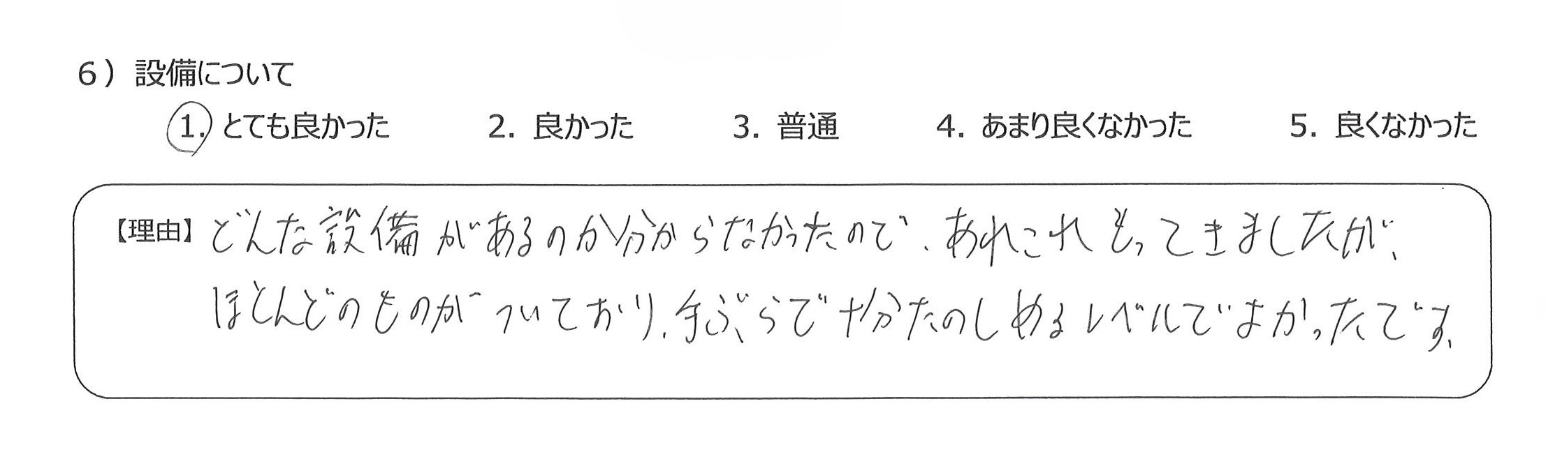 とても満喫できました。4)とても詳しく説明して下さり、安心して色んな設備のものを使うことが