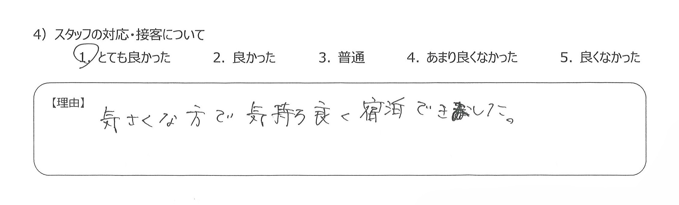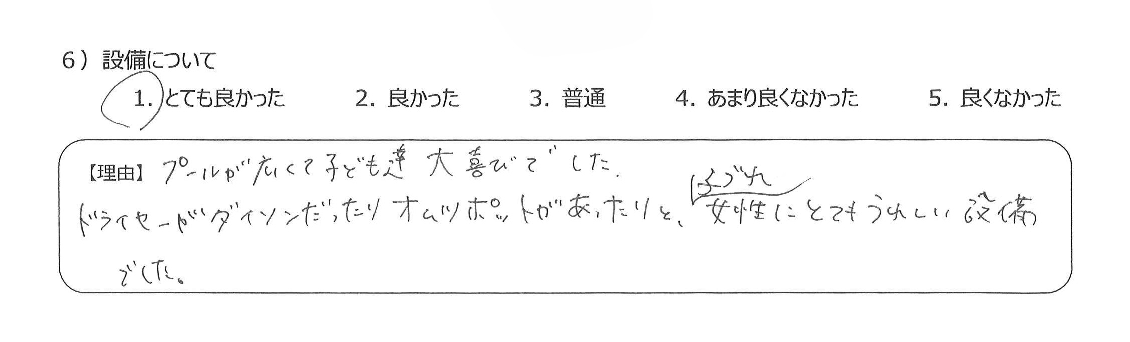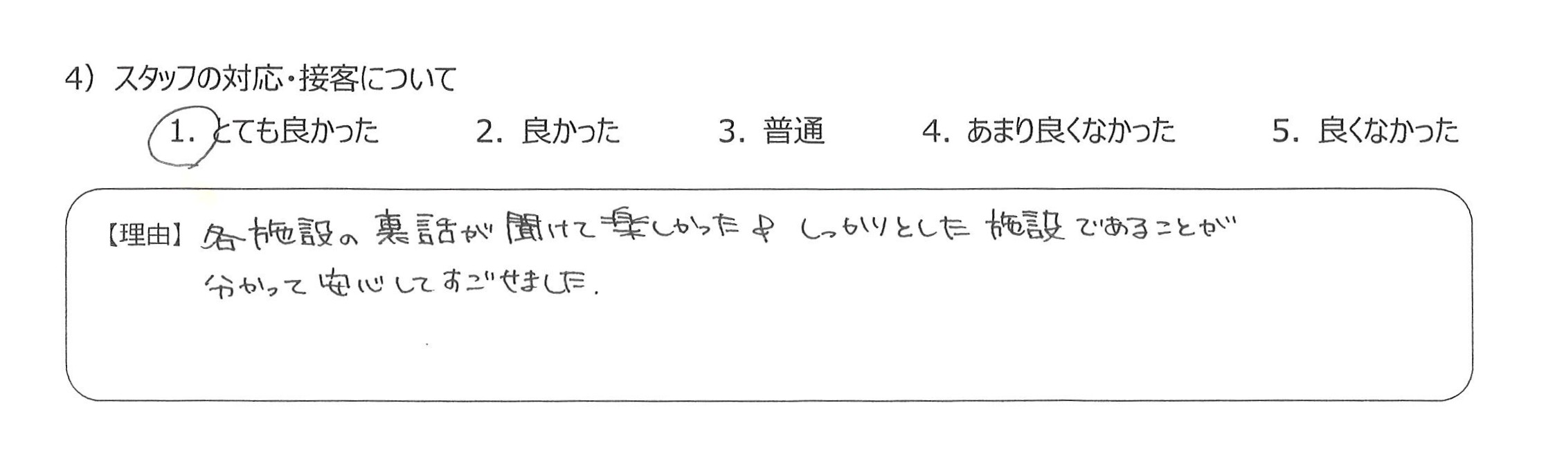 とても満喫できました。4)とても詳しく説明して下さり、安心して色んな設備のものを使うことが