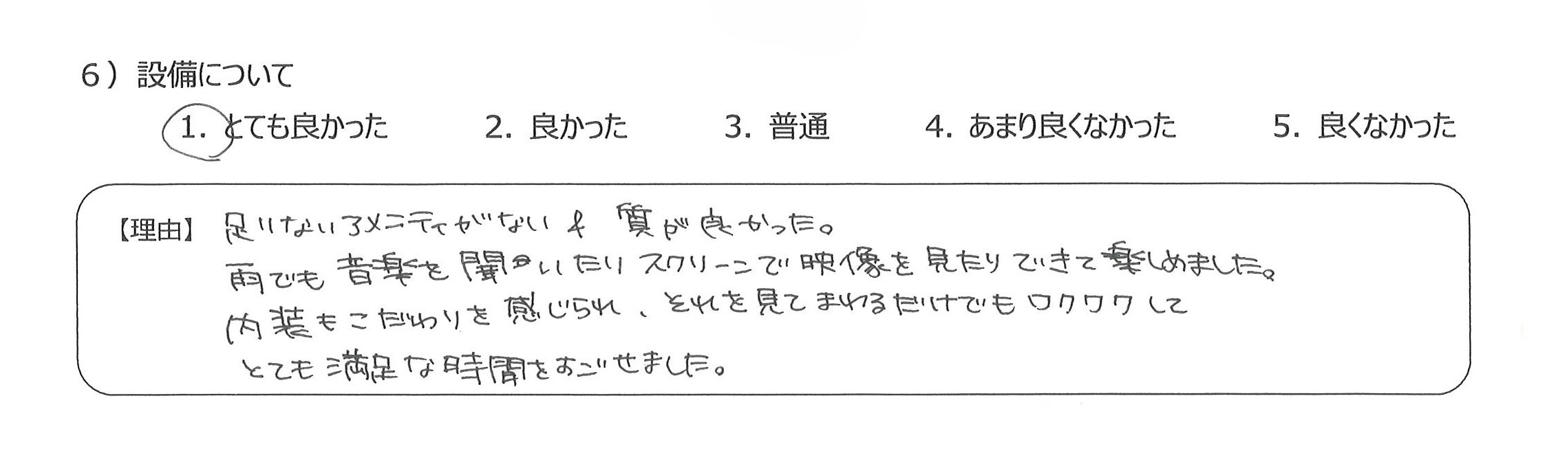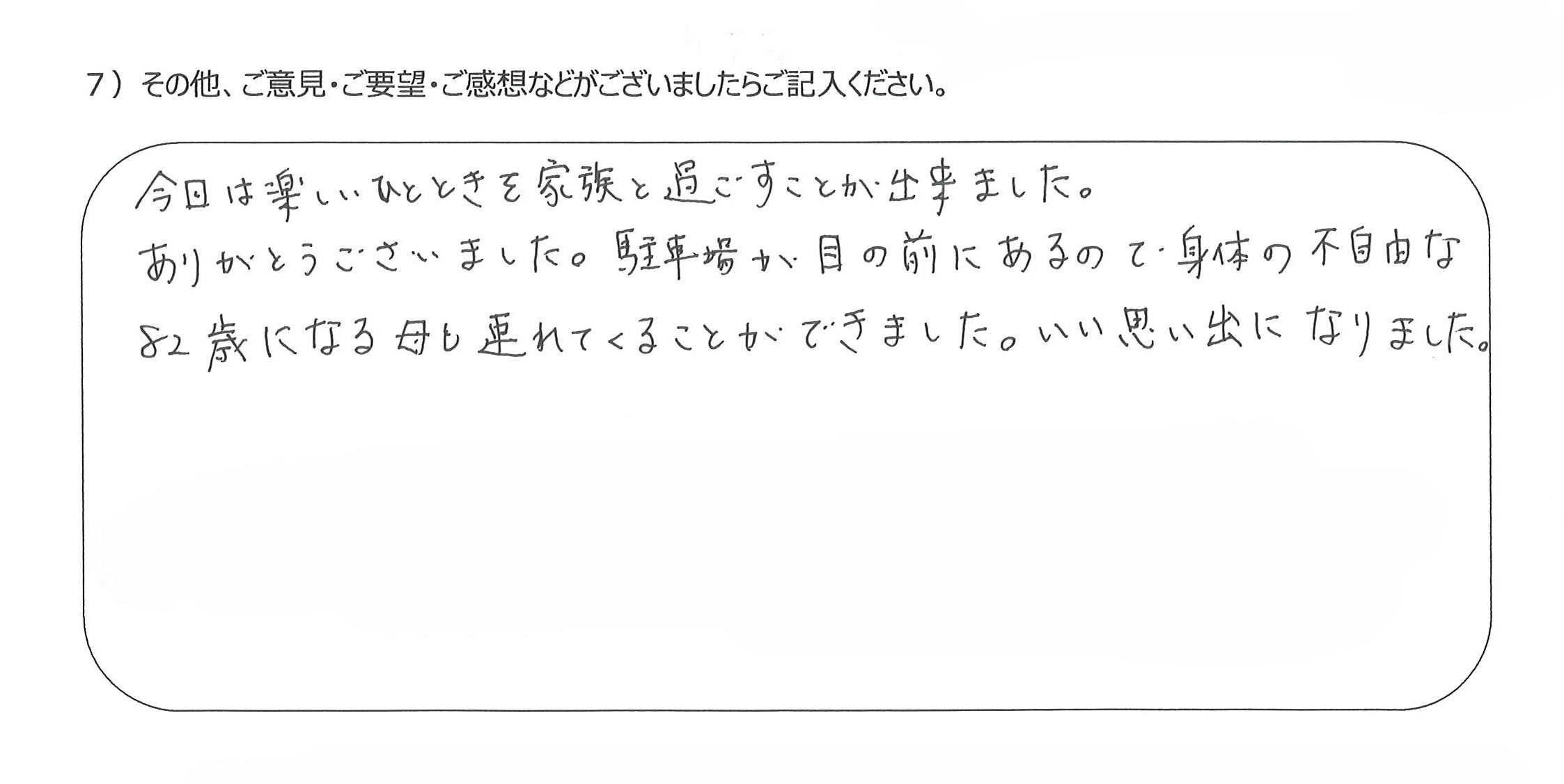 間でも気さくに話しかけていただき楽しかったです。7)今回は楽しいひとときを家族と過ごすことが出来ました。