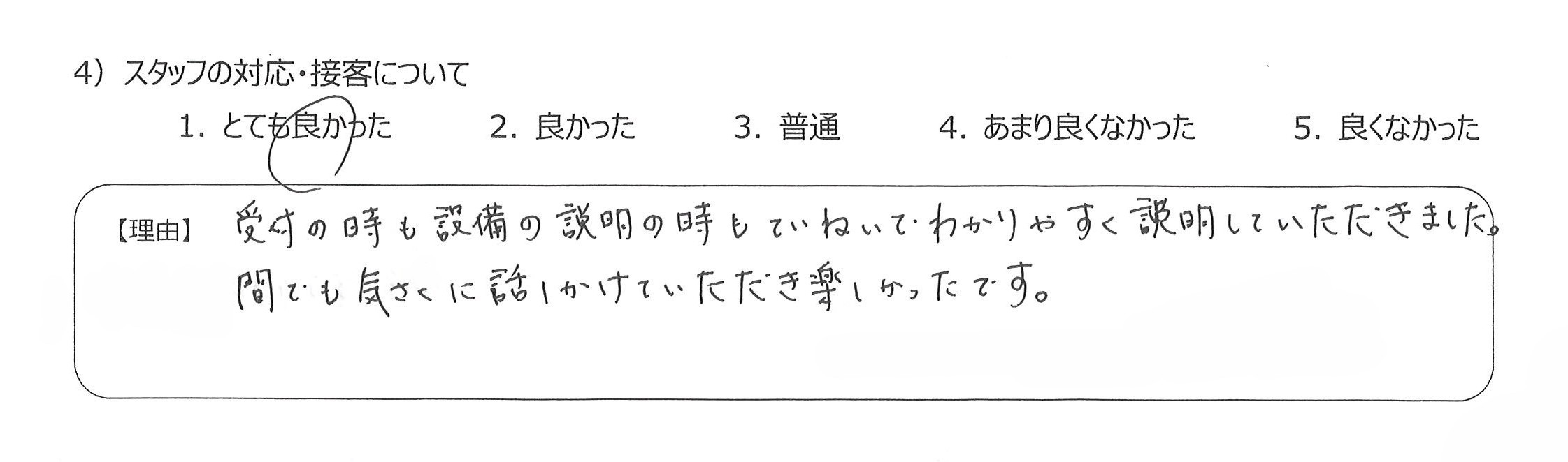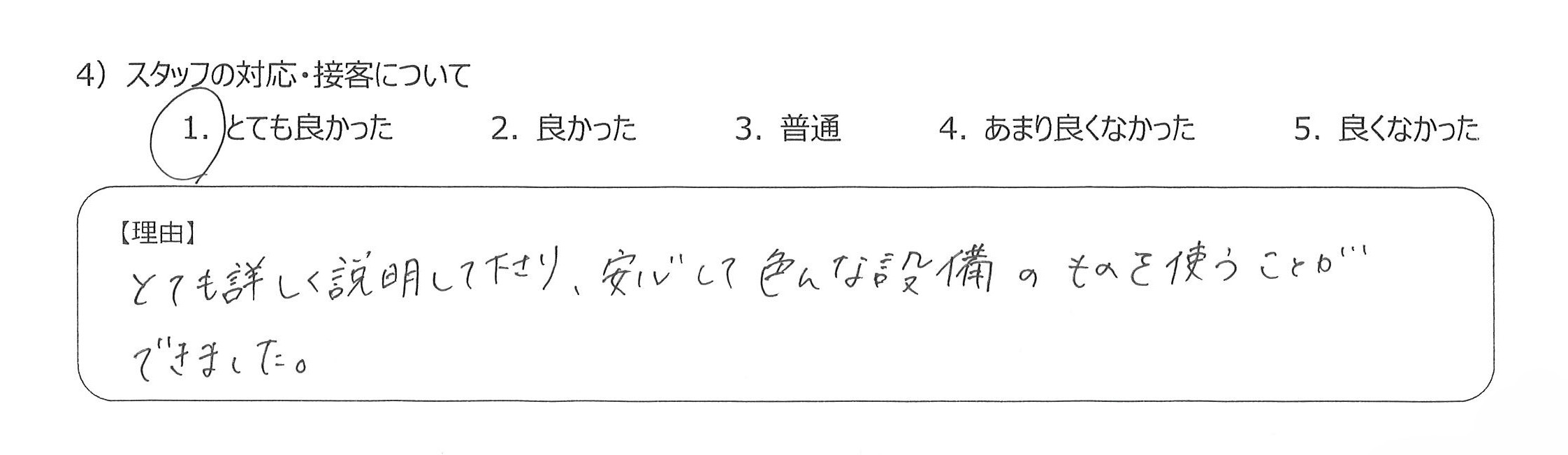 出来ました。ありがとうございました。4)受付の時も設備の説明の時もていねいでわかりやすく説明していただきました。