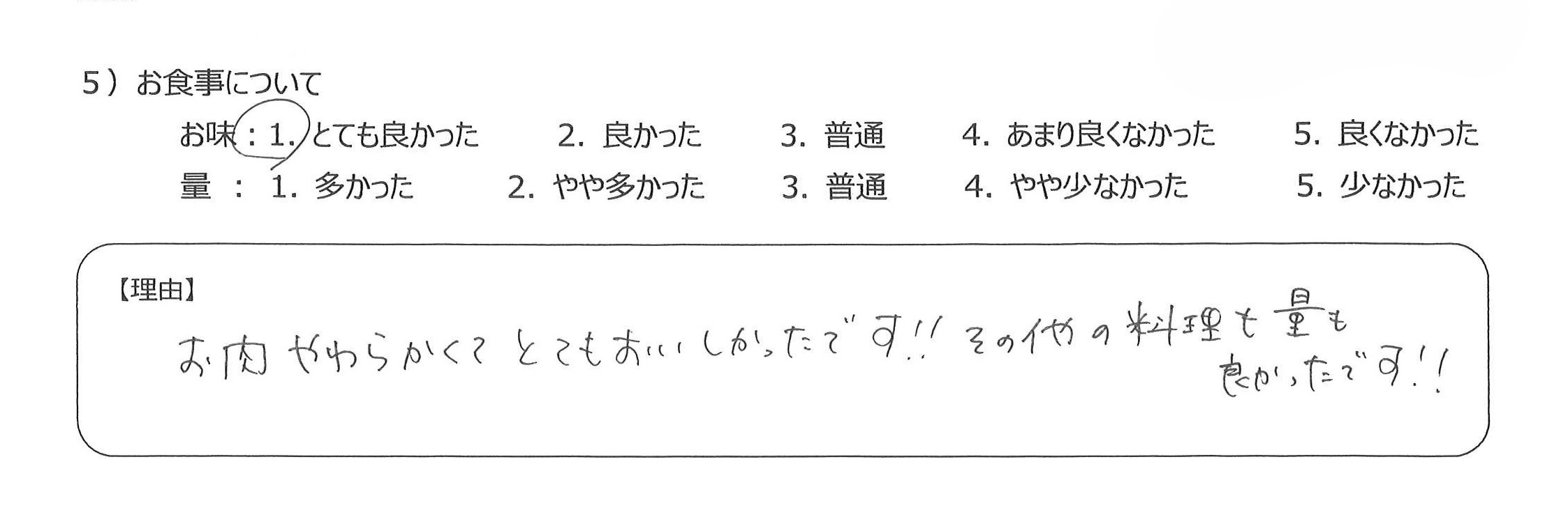 できました。5)お肉やわらかくてとてもおいしかったです!!その他の料理も量も良かったです!!