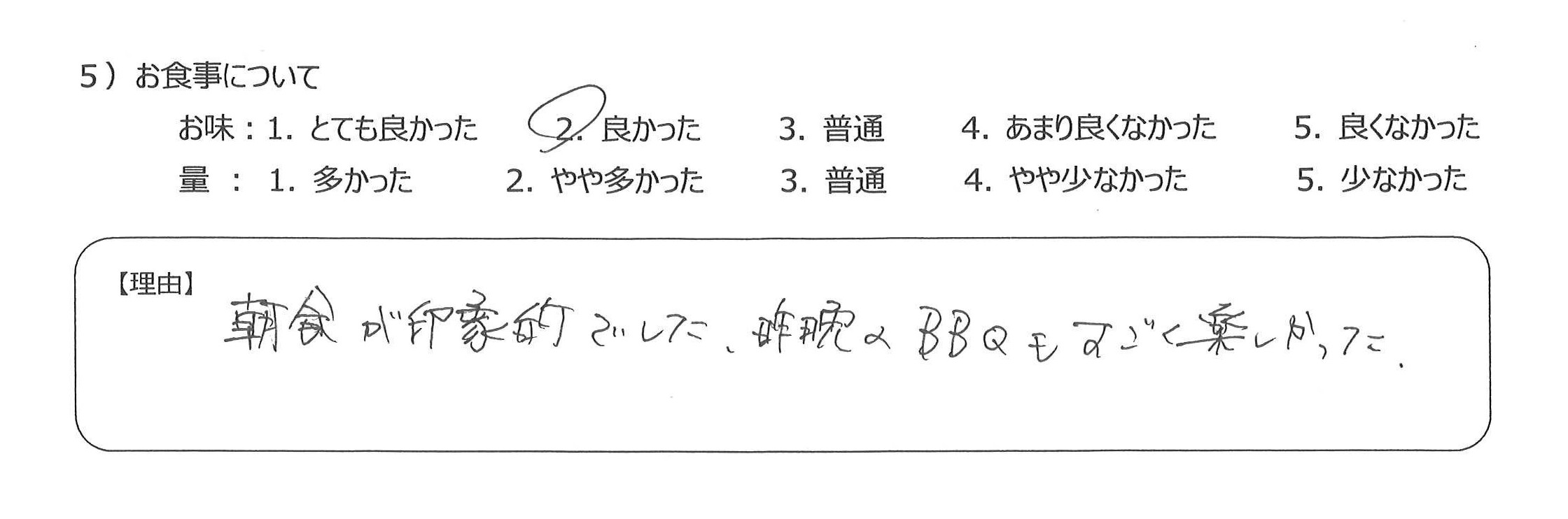 5)朝食が印象的でした。昨晩のBBQもすごく楽しかった。